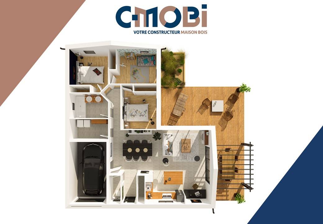 C-MOBI, constructeur de maisons en bois en Gironde et dans les Landes, vous présente son modèle de maison en "L" TRANO.